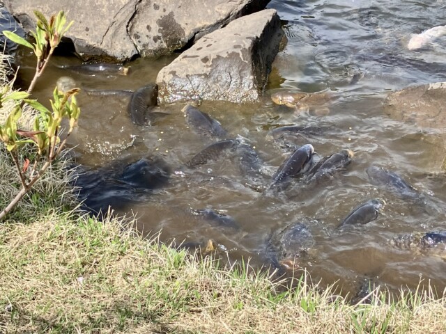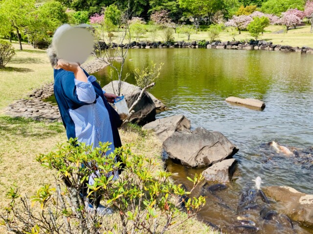 嬉しそうに鯉にエサを…!!